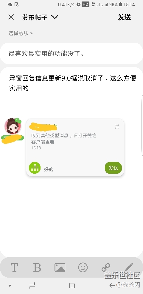 浮窗回復(fù)信息更新9.0據(jù)說取消了,這么方便實(shí)用的功能三星給取消,怎么想的,當(dāng)初第一次用三星就是因?yàn)檫@個(gè)功能。不懂什么是浮窗回信息的看圖