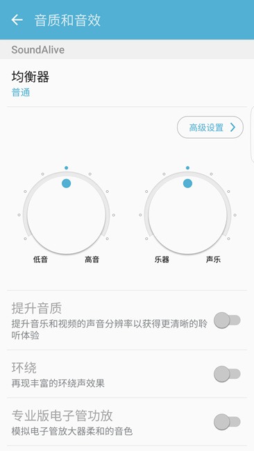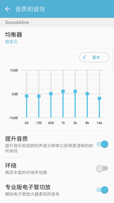 這里需要再次說明的是國內(nèi)銷售的行貨為高通驍龍820版本,音頻CODEC為高通WCD9335。還有一顆美信的MAX98506用于外放揚(yáng)聲器的放大。高通CODEC聲音風(fēng)格上通常較為中性,不同品牌機(jī)型最終音質(zhì)表現(xiàn)千差萬別,以三星的技術(shù)實(shí)力,做好應(yīng)該不是難事。S7 Edge運(yùn)行Android 6.0系統(tǒng),內(nèi)置音樂播放器功能簡單,音效部分有EQ均衡器調(diào)節(jié)、改變聲場、音色等功能。