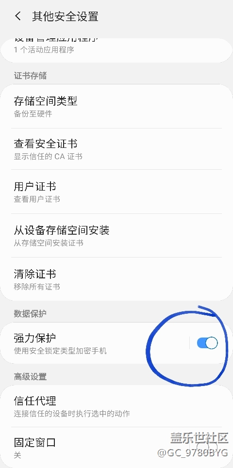 先在設(shè)置里找到我圈出來(lái)的這一項(xiàng),直接搜索“強(qiáng)力保護(hù)”就行,把開(kāi)關(guān)關(guān)了再重新打開(kāi)。