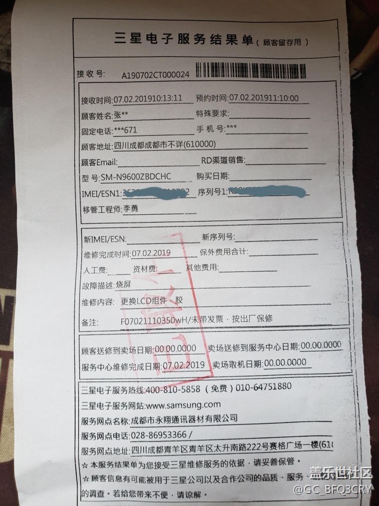 三星售后挺快的沒到1個小時就換好了