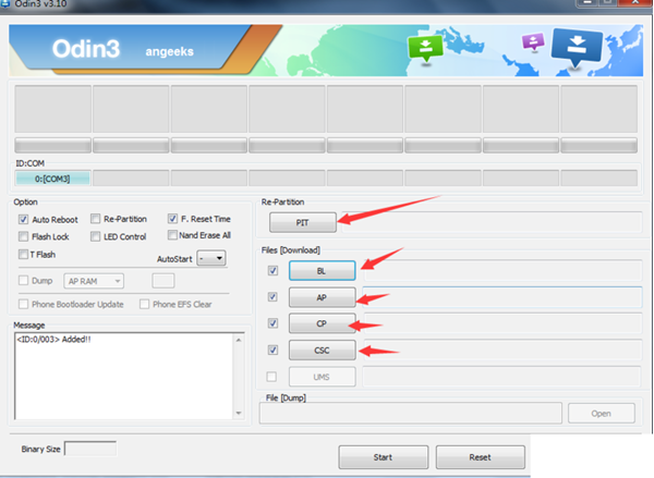 如你下載的固件為一體包,文件后綴是.TAR或者.TAR.MD5則單放AP文件選項即可
