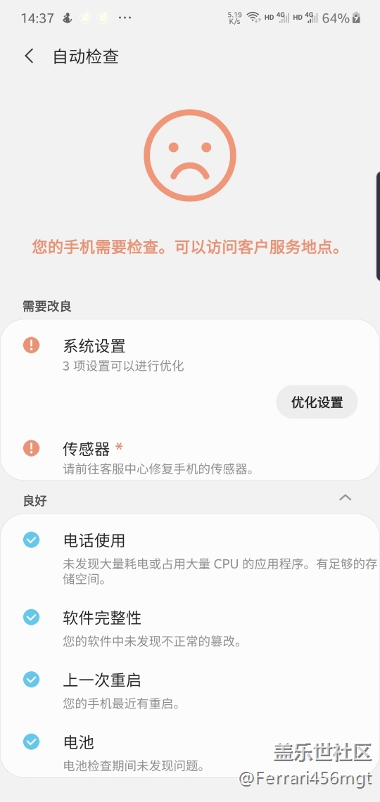 半個(gè)月前就發(fā)發(fā)現(xiàn)這個(gè)問題了,手機(jī)設(shè)置成自動(dòng)亮度調(diào)節(jié),但是亮度不能自動(dòng)調(diào)節(jié),打三星客服電話,他可能說是手機(jī)管家的問題,把手機(jī)管家卸了以后,好像有一段時(shí)間沒有這個(gè)問題了,今天又碰到了,已經(jīng)重啟過幾次了!手機(jī)使用到現(xiàn)在一個(gè)月不到,大家有沒有碰到相同的情況?用手機(jī)自帶的檢測(cè)工具檢測(cè)后發(fā)現(xiàn)有傳感器報(bào)警,但是具體也沒說哪個(gè)傳感器。