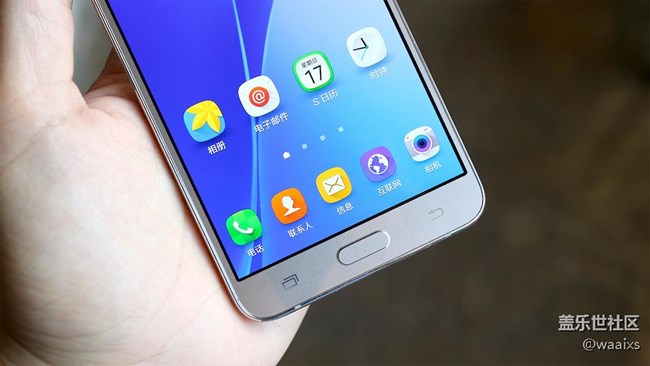 下方則是三星一直堅(jiān)持的實(shí)體按鍵+雙虛擬的設(shè)計(jì),需要額外說(shuō)明的是,三星Galaxy J7的實(shí)體鍵幾乎零凸起,必須給予好評(píng);或許是因?yàn)榍г獧C(jī)的原因,兩個(gè)虛擬按鍵并沒(méi)有背光燈,但卻不影響使用。從上圖我們還可以看到,三星Galaxy J7的BM區(qū)控制的還不錯(cuò),比起很多廠商的跑馬大黑邊/黑色壁紙掩護(hù),倒顯得更為真性情,更重要的是,Super AMOLED屏幕的色彩飽滿度格外誘人。