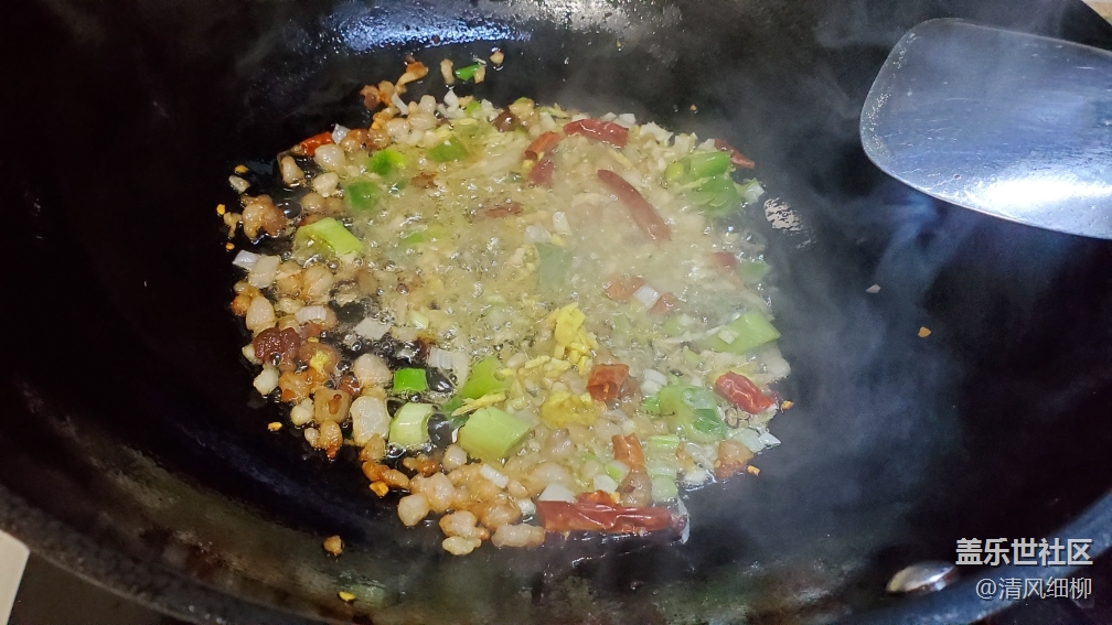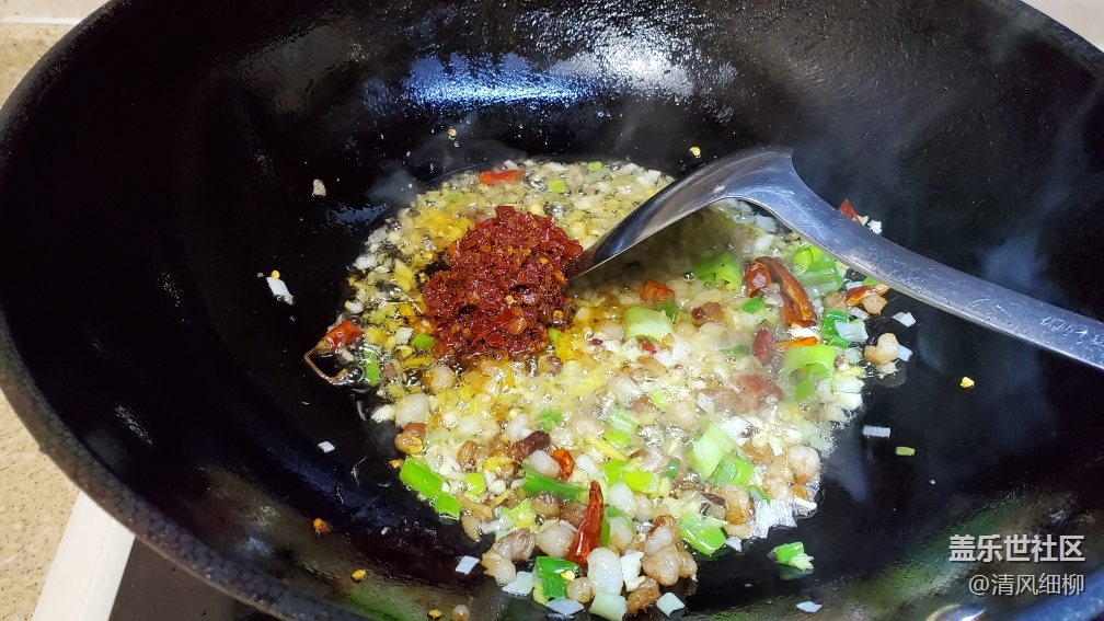 2、鍋燒熱倒入一兩菜籽油,加入豬肉小火煸炒出油,放入干花椒五六粒,再加入蔥姜蒜煸炒30秒,開中火加入豆瓣醬(最好是郫縣豆瓣醬),煸炒大約兩分鐘,待豆瓣醬炒出醬紅色,倒入炸好的豆腐翻動(dòng)均勻,加提前備好的開水,以鍋中豆腐持平略多為好,不能太多,再加入胡椒面,生抽一小勺大約5克,中火燒開,加蓋悶煮三分鐘,倒入蒜苗和木耳(也可以其他配菜)煮一分鐘,品嘗咸淡,可以加入白糖和雞精,鹽味不夠再加點(diǎn)鹽,翻炒均勻起鍋裝盤,灑上花椒面和蔥花,怕麻的可以不加花椒面。