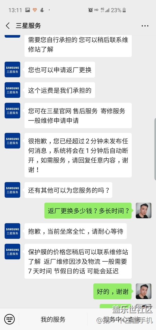 換原裝膜可以,和三星的售后對(duì)話 圖片