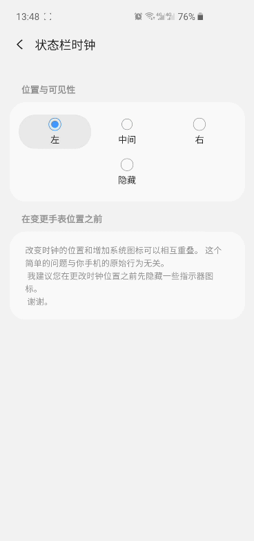 Good Lock適配2.0的更新里S10狀態(tài)欄可以設(shè)置時鐘位置居中,本來是很好的一件事,奈何設(shè)置居中后鬧鐘圖標(biāo)將不能在左邊顯示,而是直接消失(見動圖),而且還時不時出現(xiàn)和時間重合的情況(見圖)。建議左邊顯示圖標(biāo)。