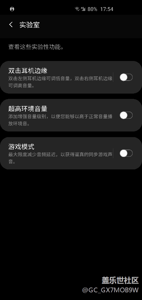 新增加了實(shí)驗(yàn)室,里面有耳機(jī)邊緣觸控,開啟以后觸碰邊緣可以調(diào)節(jié)音量,這個(gè)很難用,建議關(guān)閉。