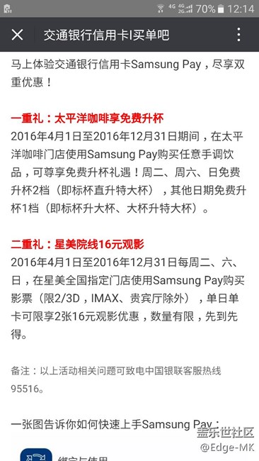 如圖,尼瑪,真表臉?;顒?dòng)時(shí)間居然從4.1開(kāi)始,尼瑪,三棒呸今天才正式支持交行卡。目測(cè)只有62開(kāi)頭的銀聯(lián)卡才可以參加活動(dòng)。說(shuō)白了,就是銀聯(lián)的活動(dòng)??梢越恍邪l(fā)行的信用卡中大量都是雙幣卡,不是62開(kāi)頭的。唉:-(也沒(méi)有送積分。今天收到交行短信,說(shuō)刷2次卡就可以送60刷卡金,可能是太久沒(méi)刷交行卡的緣故,交行在提醒我還不趕緊去刷卡????因?yàn)槿ツ瓿t星期五我被交行坑了,送的刷卡金不能用,所以一直拒絕再刷交行卡。