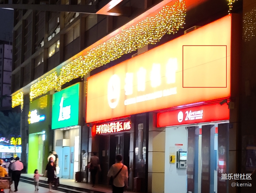 圖片中框框內(nèi)的招牌本來是紅色的,但拍下來的照片偏色成*!