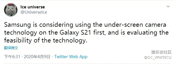 帖子名稱: 曝三星 Galaxy S30(S21) 配備屏下攝像頭