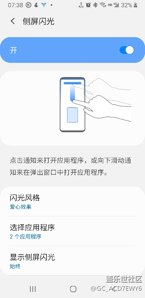 側(cè)屏閃光已開啟,但播放酷狗音樂的時候未顯示側(cè)屏閃光。原三星音樂是支持播放音樂時側(cè)屏閃光的,建議優(yōu)化改善兼容應(yīng)用程序!