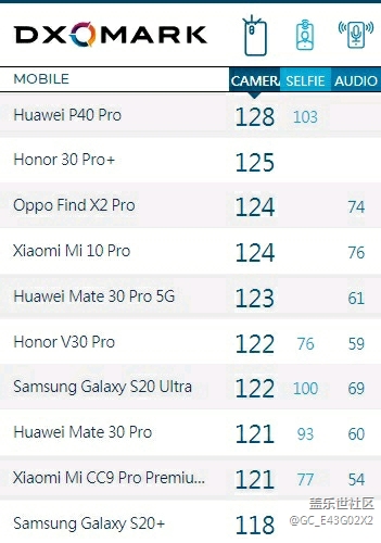 在DXOMARK相機評分排行版中,三星Galaxy S20 以118分排名第十,與三星Galaxy S20 Ultra相差4分。