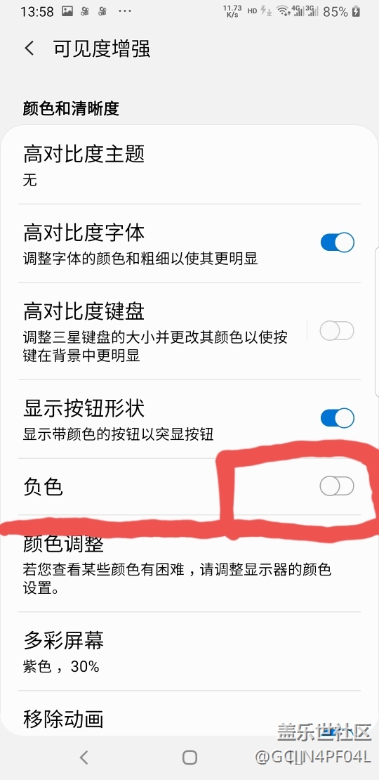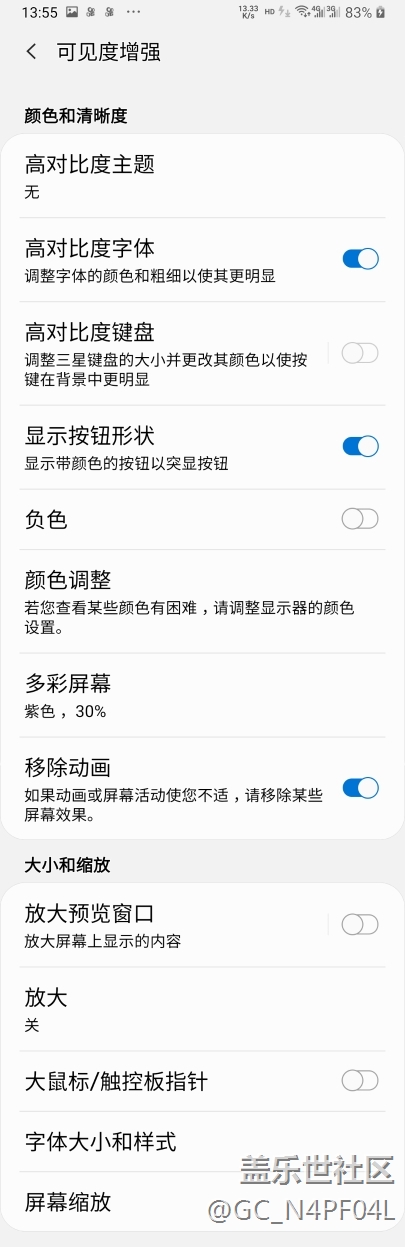 負(fù)色一開啟主題美噠噠!!但是視頻看不了?。《嗖势聊蛔仙_啟加上高對(duì)比度字體!!這樣子手機(jī)就可以不要貼護(hù)眼紫光膜了?。∪堑目梢姸仍鰪?qiáng)選項(xiàng)還挺不錯(cuò),值得點(diǎn)贊!!你們會(huì)玩了嗎??