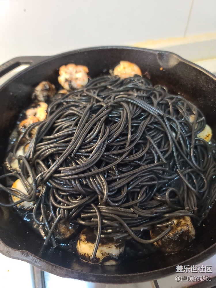 蝦和帶子煎好后倒入墨魚汁意面醬,翻炒2分鐘