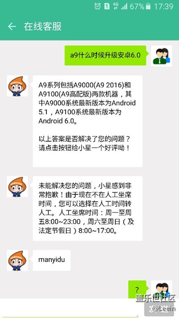關(guān)于A9升級安卓6.0 客服是這樣說的 圖片