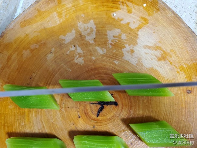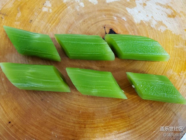 萵筍去皮,斜切成段,在切成旗子塊(就是紅旗的樣子),很多人切出來是長(zhǎng)方塊,就是方向沒整對(duì)嘛,這里圖示給你,還不會(huì)就是奔奔了。